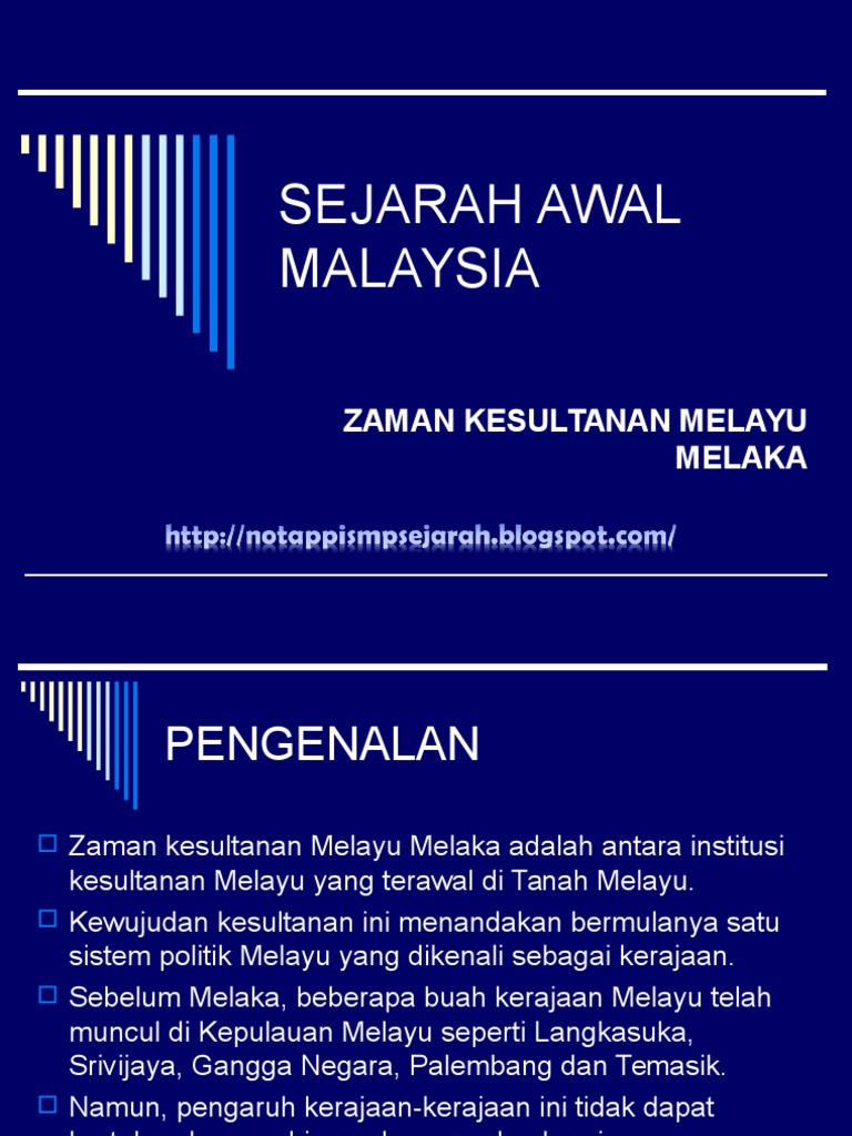 Pengenalan kegemilangan kesultanan melayu melaka. 3 2 kesultanan melayu melaka asas pembentukan negara dan bangsa kesultanan melayu melaka pada abad ke 15 merupakan asas pembinaan negara dan bangsa kita. Kegemilangan kesultanan melaka maka segala dagang atas angin dan bawah angin sekaliannya datang ke melaka. Nama kesultanan melayu melaka cukup terkenal pada suatu ketika dahulu dan muncul sebagai pusat perdagangan antarabangsa pada pertengahan abad ke 15.