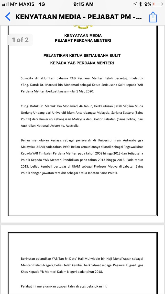 Melissa Goh On Twitter Pm Muhyiddin Yassin Has Appointed His Former Special Aide 46 Yr Old Dr Marzuki Mohamad As Chief Private Secretary The Appointment Took Effect On March 1 2020 Https T Co Nc6d46eu0r